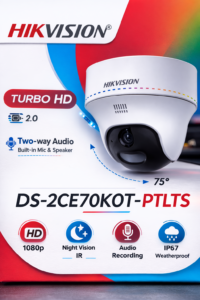 كاميرا المراقبة Hikvision DS-2CE70D0T-PTLTS هي كاميرا “Dome” داخلية بدقة 2 ميجابكسل تعمل بتقنية Turbo HD، وتتميز بـ صوت ثنائي الاتجاه (ميكروفون وسماعة مدمجة)، إضاءة هجينة ذكية (Smart Hybrid Light) لرؤية ليلية ملونة أو بالأبيض والأسود حتى 20-25 مترًا، مع إمكانية التحريك والإمالة (PT) يدويًا لضبط الزاوية